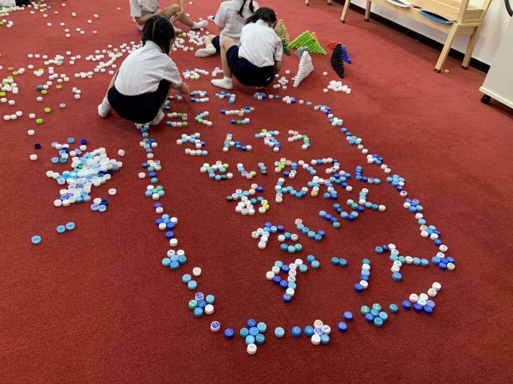 リスブランにたくさんのペットボトルキャップを広げて造形遊びをおこないました。 ...