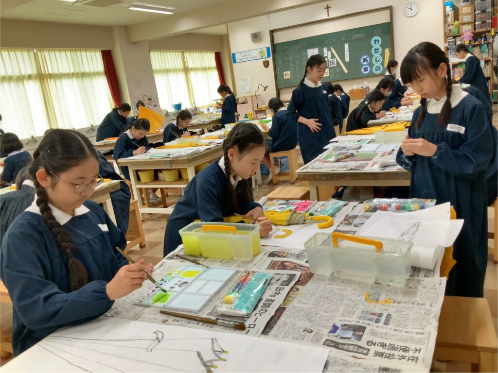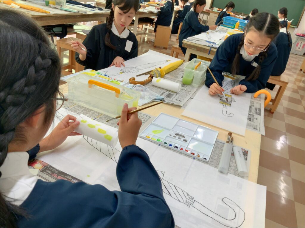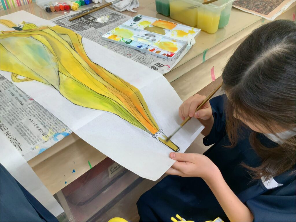 鉛筆でかきはじめ、墨と割りばしペンで線描していきます。着色では、同じように見える色の中にどのくらい色相の変化があるのかを探しながら表現していました。