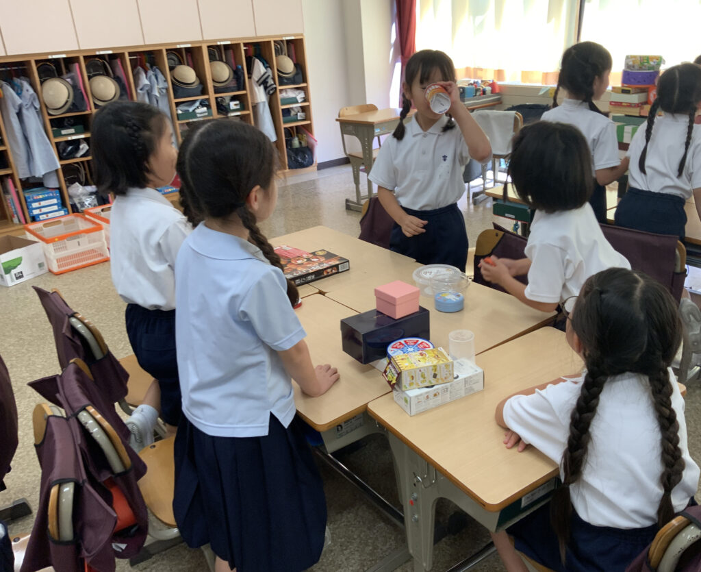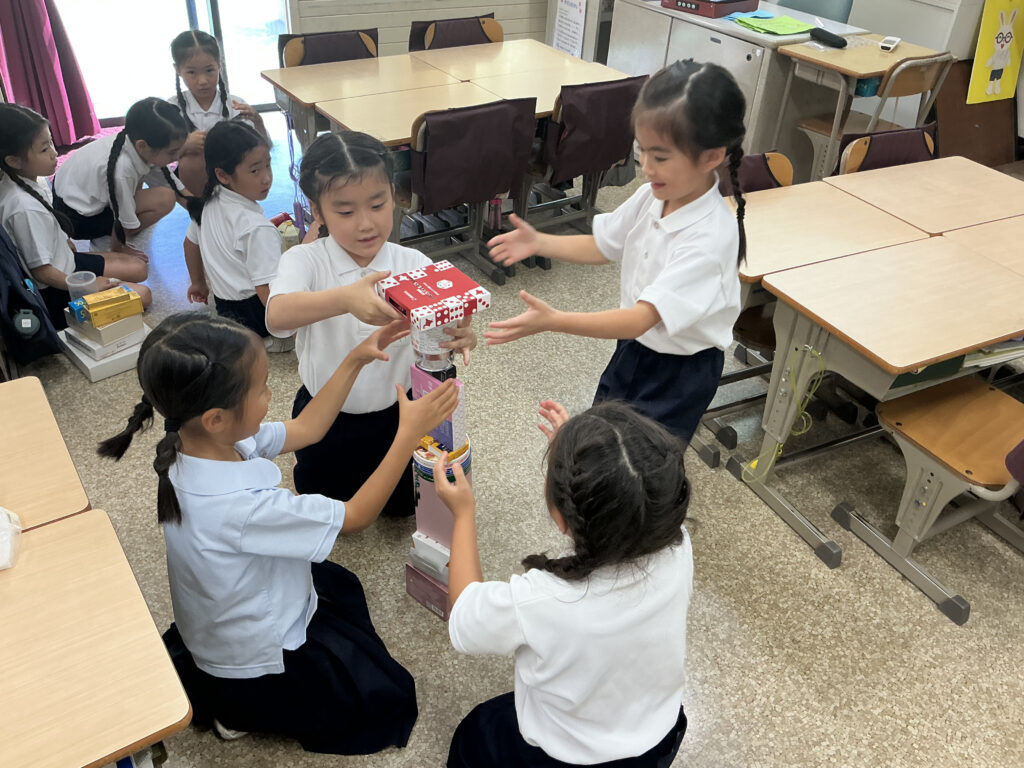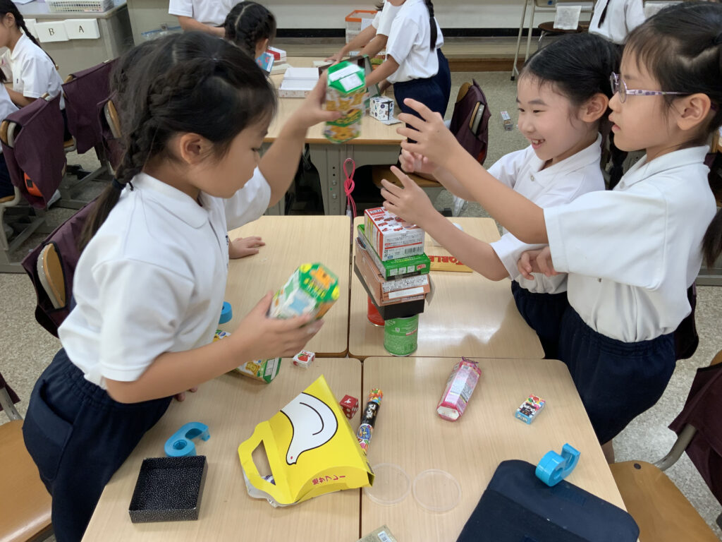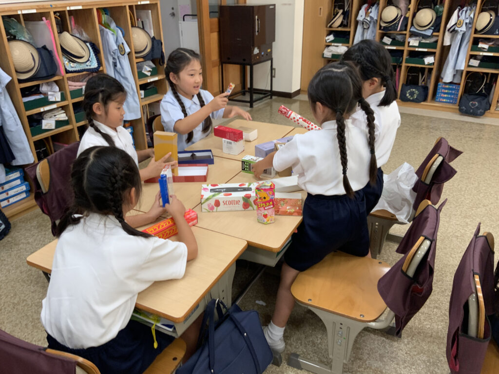 身の回りにある箱を持ち寄り、仲間分けしたり、高く積んだりしました。それぞれの箱の特徴に注目しながら形遊びを楽しみました。